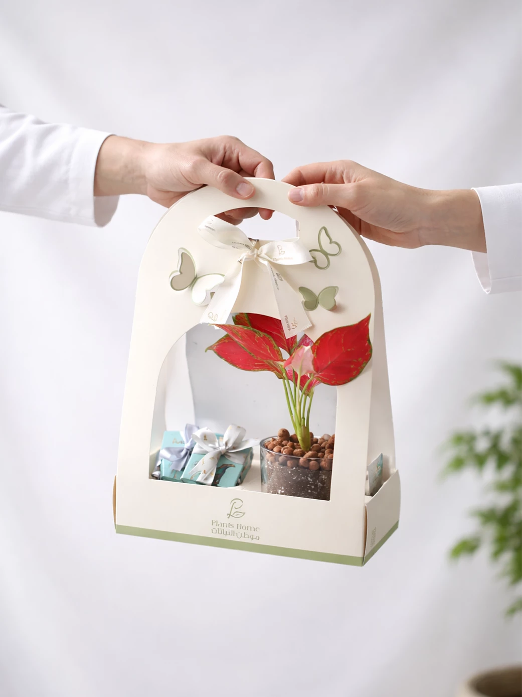 تألق بفخامة اللون الأحمر مع نبتة “الأجلونيما” الساحرة، التي تأتي في حوض زجاجي بتصميم فريد يبرز تفاصيل جذورها وجمال أوراقها. هذا التنسيق ليس مجرد نبتة، بل قطعة فنية تنبض بالحياة، تضفي لمسة من الدفء والتميز على أي طاولة أو مكتب توضع عليه.